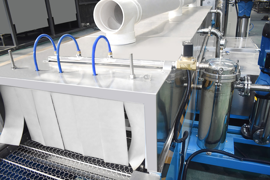 該設備有上下料網(wǎng)帶、超聲波清洗工位、噴淋漂洗工位、高壓風切、熱風烘干工位、溫控水加熱系統(tǒng)、風機、溫控空氣加熱系統(tǒng)、移動式風刀、PLC+觸摸屏控制系統(tǒng)、管路系統(tǒng)及智能電器控制系統(tǒng)等組成。自動進排液和自動加溫系統(tǒng)完全實現(xiàn)了無人干預,自動運行,很大程度上降低了工人的勞動強度。先進的霧氣處理系統(tǒng)可以將清洗時產(chǎn)生的霧氣冷凝回流,空氣經(jīng)過濾和活性炭吸附后排出。