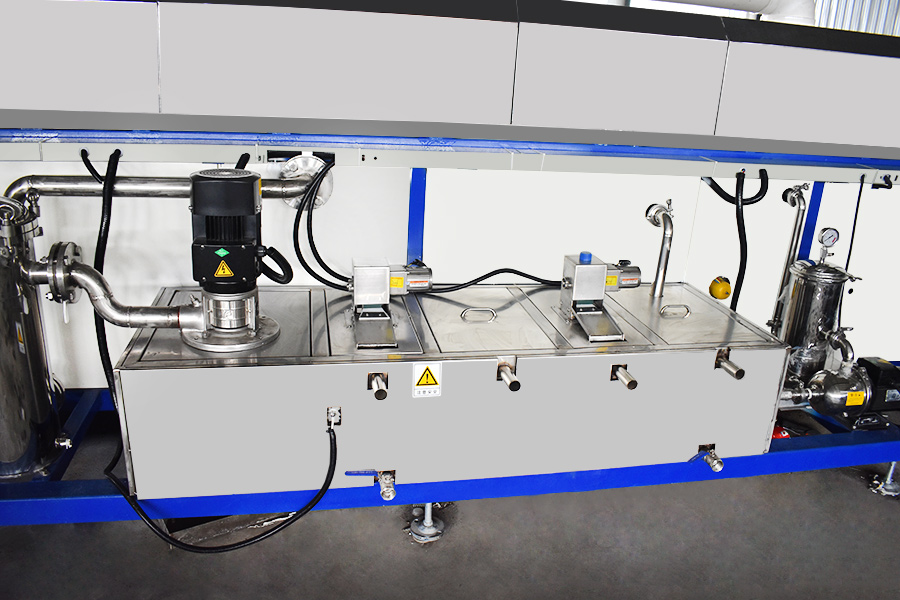 該設備有上下料網帶、超聲波清洗工位、噴淋漂洗工位、高壓風切、熱風烘干工位、溫控水加熱系統、風機、溫控空氣加熱系統、移動式風刀、PLC+觸摸屏控制系統、管路系統及智能電器控制系統等組成。自動進排液和自動加溫系統完全實現了無人干預,自動運行,很大程度上降低了工人的勞動強度。先進的霧氣處理系統可以將清洗時產生的霧氣冷凝回流,空氣經過濾和活性炭吸附后排出。