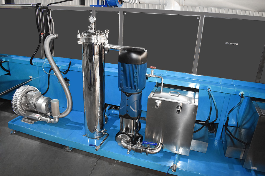 該設(shè)備有上下料網(wǎng)帶、超聲波清洗工位、噴淋漂洗工位、高壓風(fēng)切、熱風(fēng)烘干工位、溫控水加熱系統(tǒng)、風(fēng)機、溫控空氣加熱系統(tǒng)、移動式風(fēng)刀、PLC+觸摸屏控制系統(tǒng)、管路系統(tǒng)及智能電器控制系統(tǒng)等組成。自動進排液和自動加溫系統(tǒng)完全實現(xiàn)了無人干預(yù),自動運行,很大程度上降低了工人的勞動強度。先進的霧氣處理系統(tǒng)可以將清洗時產(chǎn)生的霧氣冷凝回流,空氣經(jīng)過濾和活性炭吸附后排出。